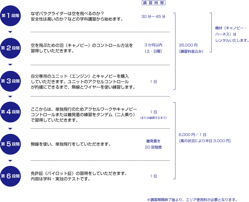 地上訓練から上空訓練までが誰でも簡単・安全に楽しく飛ぶためのこつを覚えることができます。